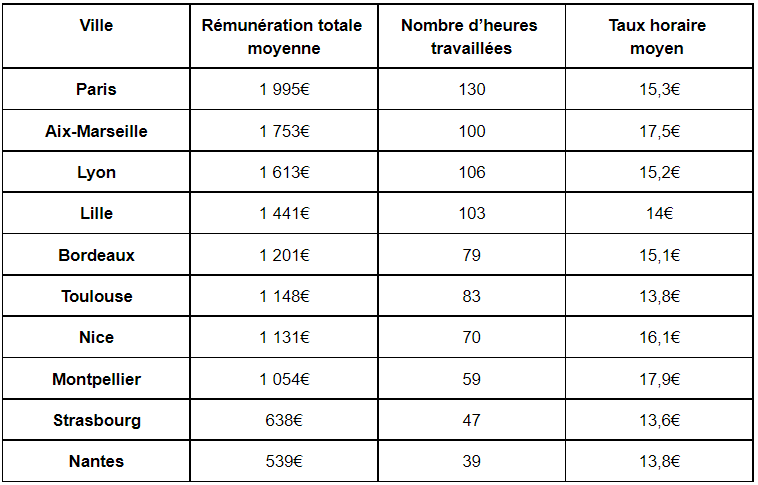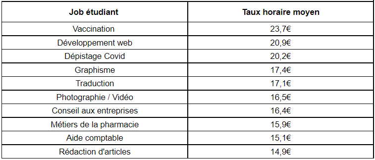 根据StaffMe的数据,2021年学生的平均收入为1,809欧元,即每小时15.17欧元。法国学生平均工作109小时。其中,巴黎的学生工作时长最长(130小时),平均收入也最高(1995欧元)。根据所需的技能,薪酬显然是不同的。有资格进行疫苗接种或进行Covid测试的医学生,平均每小时赚取超过20欧元。
