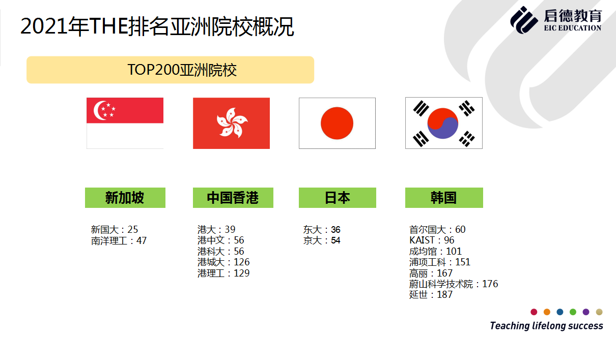 亚洲无论是新加坡还是中国香港地区的院校,一直以来在泰晤士排名当中有一个很好的表现,因为其实他们也一直以来的话是比较奉行的是英联邦的教育体制,所以整体来讲跟英系的这些国家和这些排名,学校的发展理念,包括很多指标方面的相似度会比较强一些。所以其实这两个地区,在排名方面一直还算是比较有优势的。