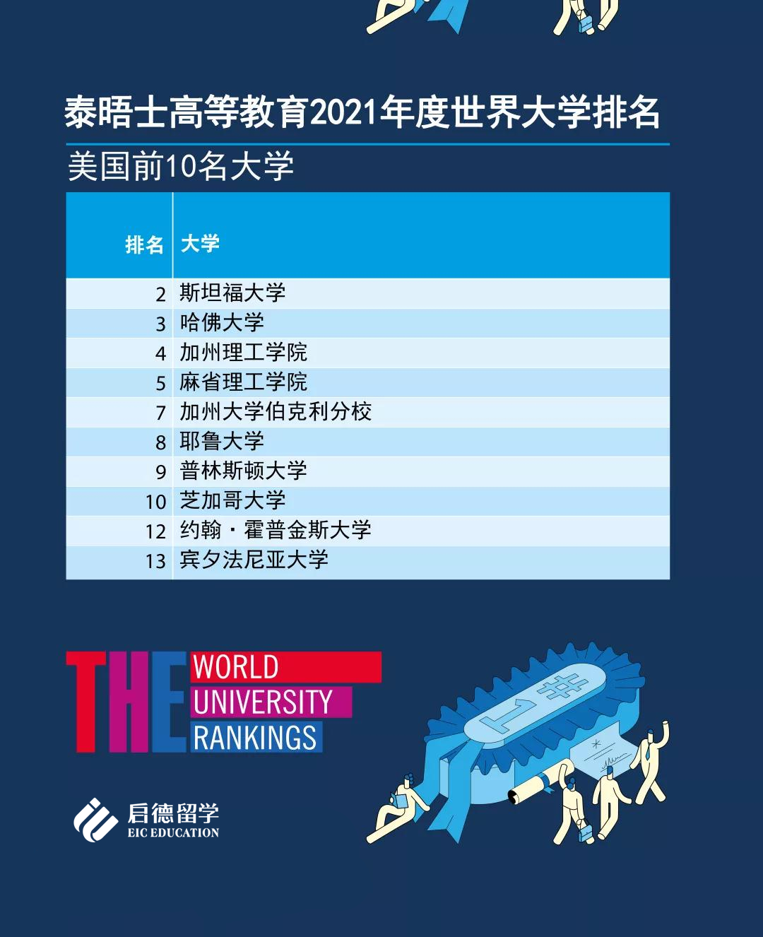 众所周知,美国大学在很多排名的榜单上都是名列前茅,在全世界前10的学校当中,排在第二位的是斯坦福大学,比之前上升了两名。然后是我们非常熟悉的哈佛大学,比去年上升了4名。世界排名当中的前10名的学校当中,有8所美国大学进入到了世界前10强,这是美国教育非常有实力的体现。