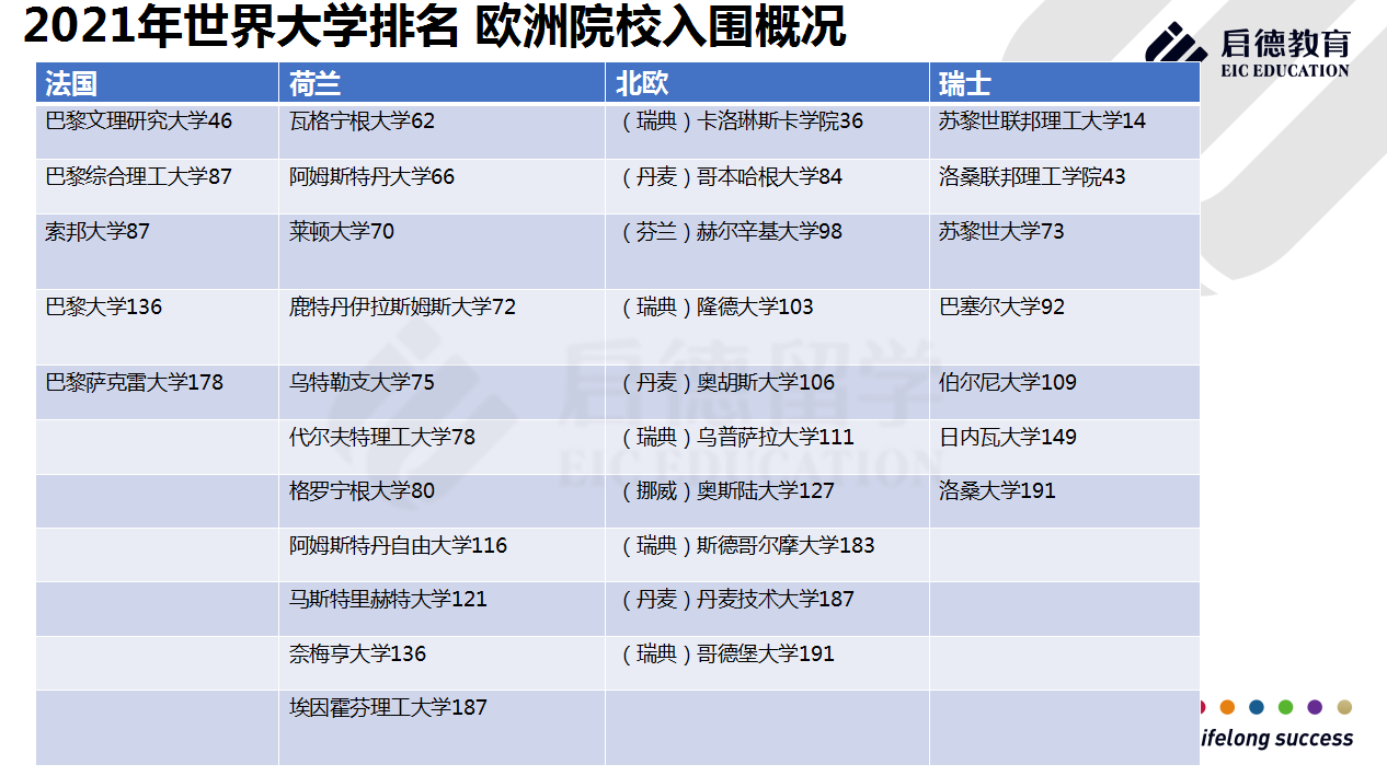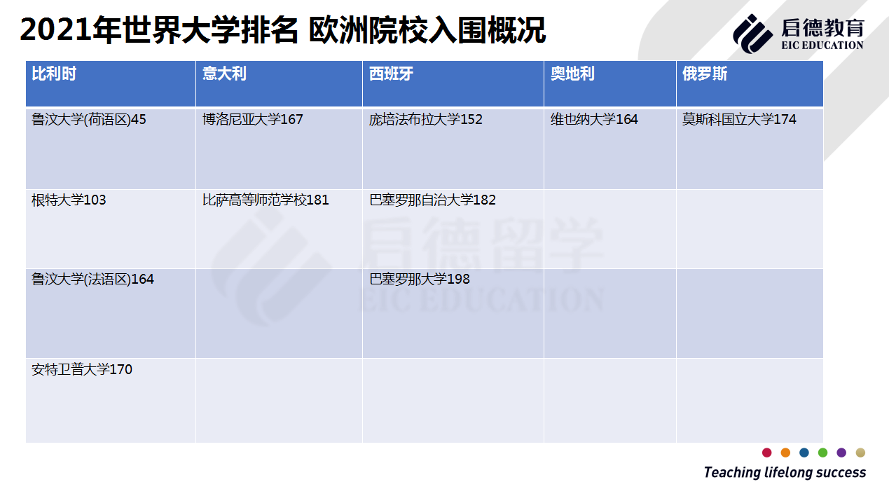最新的泰晤士高等教育2021年世界大学排名上来看,欧洲的院校(不包含英国和爱尔兰)的入围情况是前100的入围有25所,前200的入围是有66所院校。具体国家的分布,德国是有21所院校入围前200,荷兰11所,瑞士7所、法国5所、北欧4国10所、比利时4所、西班牙3所、意大利3所、俄罗斯1所、奥地利1所。