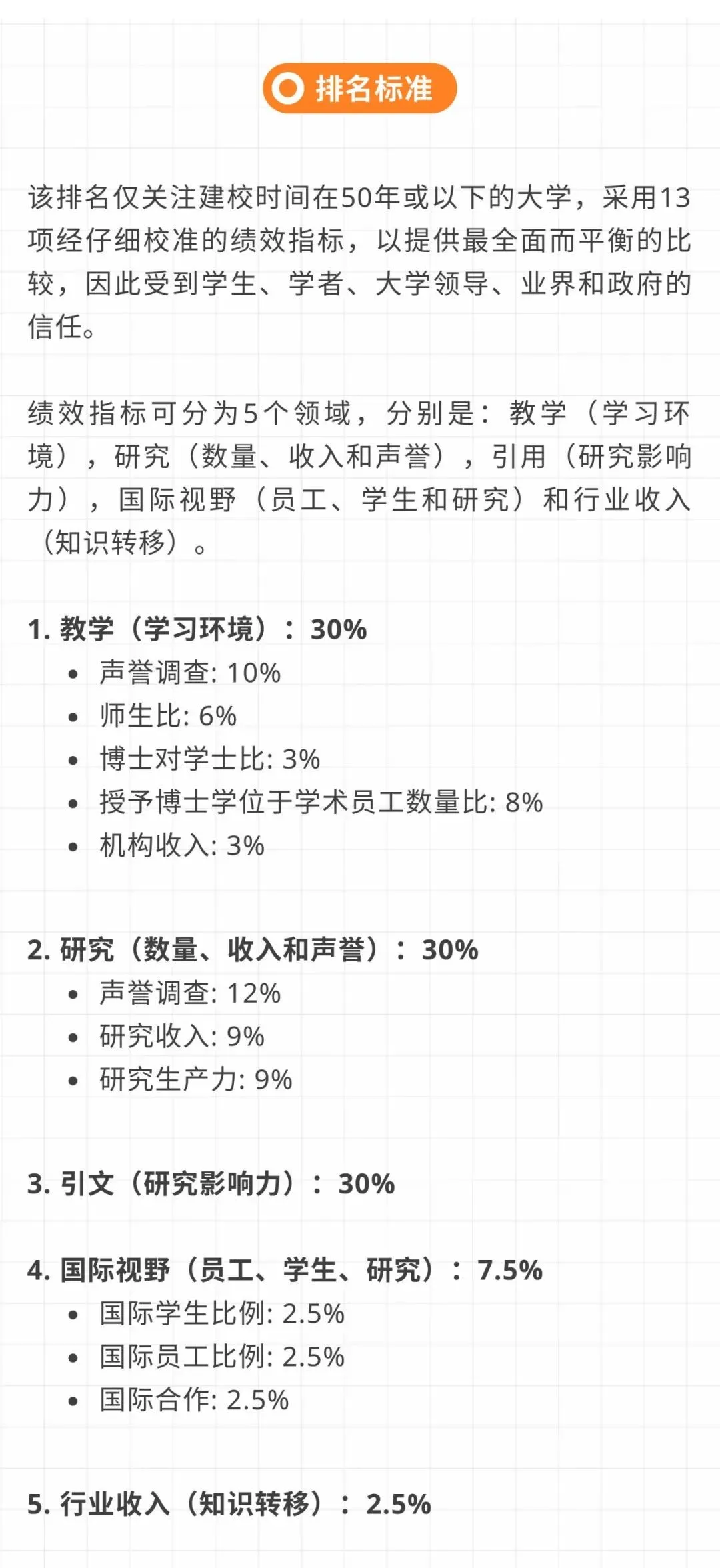 本次泰晤士高等教育年轻大学排名覆盖了来自66个国家和地区的414所大学,高于2019年的351所。泰晤士高等教育年轻大学排名基于与世界大学排名相同的指标,但其权重经过调整以反映年轻大学的使命与概貌,比如较少强调声誉调查数据,而更多地关注诸如研究生产率、师生比、机构收入和博士教育等因素。