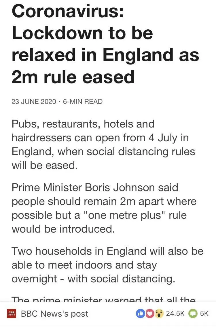 以上解封措施只适合英格兰地区,苏格兰、威尔士、北爱尔兰这三个地区的领导人都表示继续坚持2米安全距离。鲍里斯表示:7月4日起,人们将可以在自家室内与其他人相见,但是要保持社交距离,每次只能与一户家庭相见。(不是说特定的两户人家,比如这周末去爷爷奶奶家,下周末去外公外婆家这样是可以的,但不可以爷爷奶奶外公外婆七大姑八大姨全都聚在一起,如果非要聚集,请一大家子一起去室外并遵守安全规范)。我们不能一下子取消所有限制,但接触的人越少,越安全。
