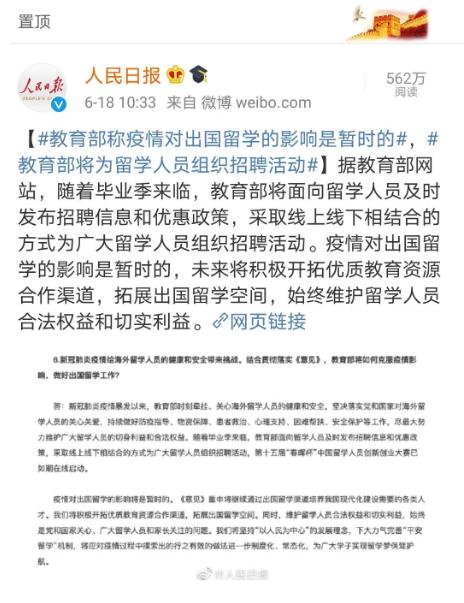 中国教育部国际司(港澳台办)负责人表示:疫情对出国留学的影响将是暂时的。教育部将积极开拓优质教育资源合作渠道,拓展出国留学空间。同时,维护留学人员合法权益和切实利益,将应对疫情过程中摸索出的行之有效的做法进一步制度化、常态化,为广大学子实现留学梦保驾护航。