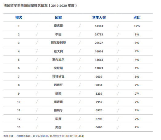 法国因其高质量且多样化的教育体制特点,每年都吸引来自世界各地的学生赴法国留学。根据法国高等教育、研究与创新部/信息系统和统计研究分部2020年发布的数据显示,2019-2020年度,法国接受了370052名国际留学生,成为全球第六大留学生接待国。比上一年增长了3%,5年来增长了23%。中国是法国留学生的主要来源国之一。