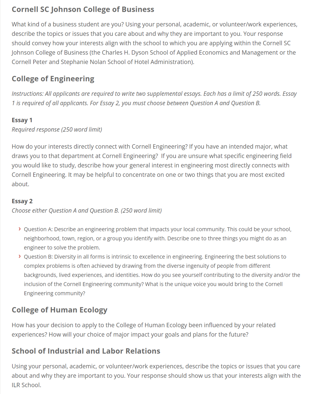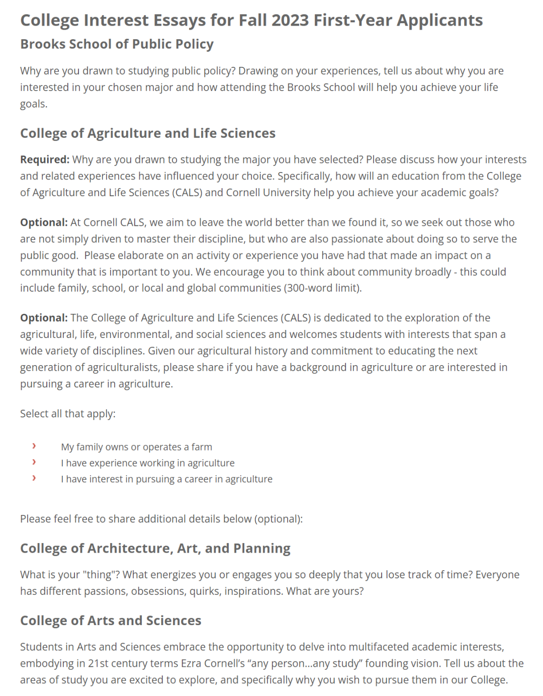 1、补充文书第一大题的单词量有减少,去年要求用半页纸或大约 250 个单词回答,今年减少到只需大约 100 个单词回答即可;3、补充文书第二大题的选择数量由原来的 6 道题增加至 10 道题,由去年的选择 1 题回答变成今年选择 2 题回答,字数也从每题 250 个单词变成了每题 50 个单词。2、农业与生命科学学院在延续了去年题目的基础上,新增了 2 道可选题;3、工程学院有两篇补充文书,其中一篇是必选,另一篇是 2 个题目任选其一;3、去年是 6 个题目自行选择 1 个回答即可,今年是 5 个题目任选其一,有 2 个题目和去年是一样的,其他 3 个题目是新增的。从这些大学补充文书要求的变化上不难看出,学校越来越看重学生的自我表达,给予了大家很大的发挥空间。但同时,学校也在通过限制字数的方式,考验学生的写作技巧,尤其是如何在短篇幅内说清楚自己的想法。