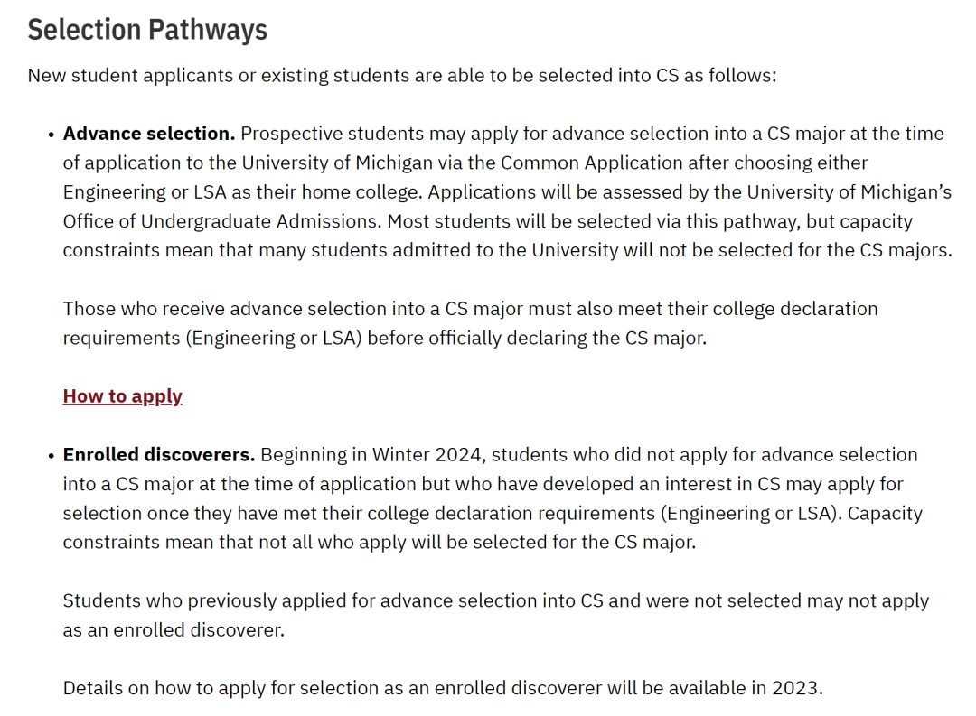 入学后申请(Enrolled Discovers)从 2024 年冬季开始,针对未通过 Advance Selection 途径预选 CS 专业,但又在入学后对 CS 专业产生兴趣的学生,他们可以在满足自己学院(工程学院或 LSA)的主修专业申报要求后申请加入 CS 专业,但班级人数限制意味着并非所有申请者都将被选入 CS 专业,即便他们已经满足了学院申报要求。曾经在 CA 申请中预选 CS 专业但未被选中的学生,不得通过 Enrolled Discovers 途径申请 CS 专业。