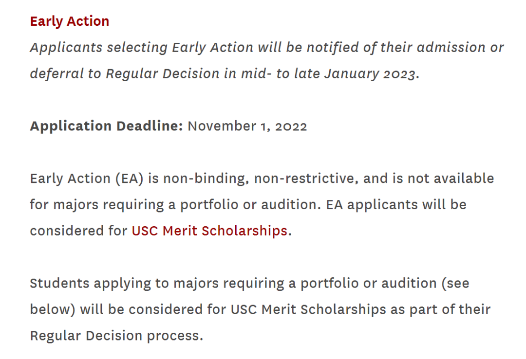 南加州大学(USC)是美国西海岸最古老的顶尖私立大学之一,拥有全美第一的电影学院,全美第二的传播学院,以及全美前三的商学院,是很多学生的女神校。不过,这所女神校一直也挺傲娇的,没有启用过任何早申请政策,还把唯一的 RD 申请截止时间放到了 1 月 15 日。对此,USC 的招生委员会负责人曾解释道,“USC 认为早申请,无论是 ED 或是 EA,都是对大学单方有益的政策。对于学生来说,提前录取抹杀了学生突破自己,录取更好学校的可能性。南加大不想 “催促” 学生做出决定,而是希望学生们想清楚再来申请。”但是,没有早申请也就意味着学校缺少了一块重要的学生来源。数据显示,在 2020-21 申请季中申请 USC 的人数为 81,000 人,而到了 2021-22 申请季只剩下 69,000 人了。同时,USC 的录取率也连续下跌,从 2020 年的 16% 直接掉到了 2022 年的 12%。由此可见,南加大可能已经逐渐沦为对早申结果不满意的学生们的备胎了。也许是为了挽回这一颓势,USC 今年悄咪咪地增加了早申请 EA 轮次(申请截止时间 11 月 1 日),并且表示将会把 20%-25% 的录取名额都分配给EA申请人。这对于喜欢 USC、又想要在申请季早点下车的学生来说,是一个万万不可以错过的机会!当然,对于学校来说,他们可以稳定住自己的申请人数和录取率,从而更好地保持学校排名。需要注意的是,以下这些专业没有早申,申请截止时间是 12 月 1 日:Roski School of Art & Design