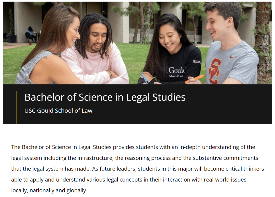 另外再给大家介绍一个 USC 申请冷知识:USC 古尔德法学院(Gould School of Law)首次为本科生开设了一个四年制的学位专业 —— 法律研究 Legal Studies。该专业特别适合有兴趣从事将法律概念与其他学科相结合的职业的学生,他们有机会深入了解法律制度的构建和实施过程,成为理性的批判者和领导者。