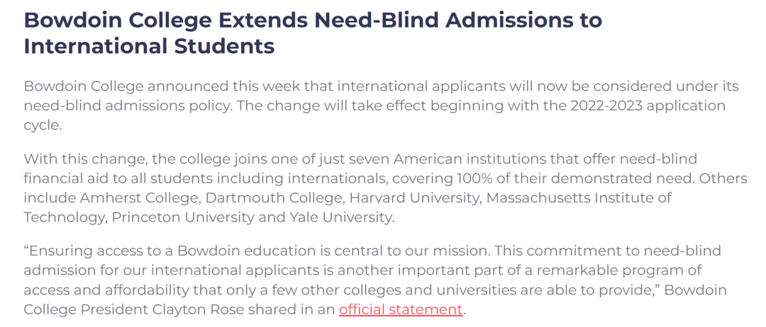 采取 Need-blind 政策的美国大学有很多,但是,大多数学校只是对本土学生采取该政策,对于国际学生都是使用 Need-aware 政策的。只有极少数美国大学对国际学生也是一视同仁的,比如普林斯顿、哈佛、麻省理工、耶鲁、哥伦比亚、阿默斯特等。去年,达特茅斯学院也加入了这一行列。就在这个月,全美文理学院排名第六的鲍登学院(Bowdoin College)宣布,其 Need-blind 政策的适用范围将扩大至国际生,且就从这个 2022-23 申请季开始!鲍登学院校长 Clayton Rose 表示,“确保鲍登教育的公平开放是我们核心任务。Need-Blind 录取承诺是我校卓有成效的开放和可负担计划的另外一个重要组成部分,仅有屈指可数的其他院校有能力提供同样的承诺。”