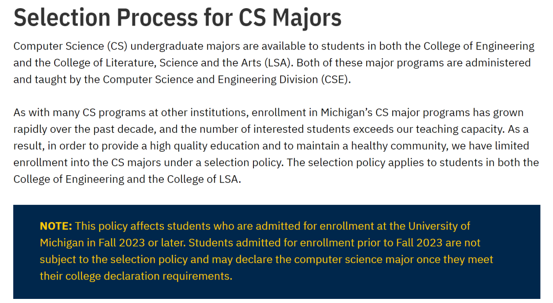 今年想要申请密歇根安娜堡 CS 专业的同学们请注意了!为了提供高质量的教育和维护一个平衡的社区,Umich 最近决定,将从 2022-23 申请季开始执行一项新的政策 —— 在 2023 年秋季或之后被 Umich 录取的学生必须在录取过程中先被选入 CS 专业,然后才能申报 CS 为主修专业(密歇根大学的学生一般在完成一年的本科课程后,并取得相应的学业成绩以及满足特定的条件,才会正式申报一个主修专业),否则将按照待公布的 2023 年新政策执行。以上的的选拔政策适用于工程学院(College of Engineering)和文学、科学与艺术学院(College of Literature, Science and the Arts)的学生,但仅适用于希望以 CS 为专业的学生,不适用于希望以计算机工程(Computer Engineering)或数据科学(Data Science)为专业的学生。