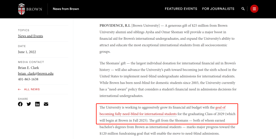 另外,再给大家剧透一个好消息,布朗大学的面向国际生的 Need-Blind 政策也指日可待啦!近日,布朗大学收到了来自一对校友兄妹的 2500 万美金捐赠,用来为布朗的国际本科生提供经济援助。这是布朗历史上最大的一笔国际经济援助个人捐赠,它也推动了布朗成为美国新一所为国际学生实施 Need-Blind 政策的学校。布朗已经预告,新的 Need-Blind 政策将使用于 2029 年毕业,也就是 2025 年秋季入学的本科学生,真是值得期待呀!