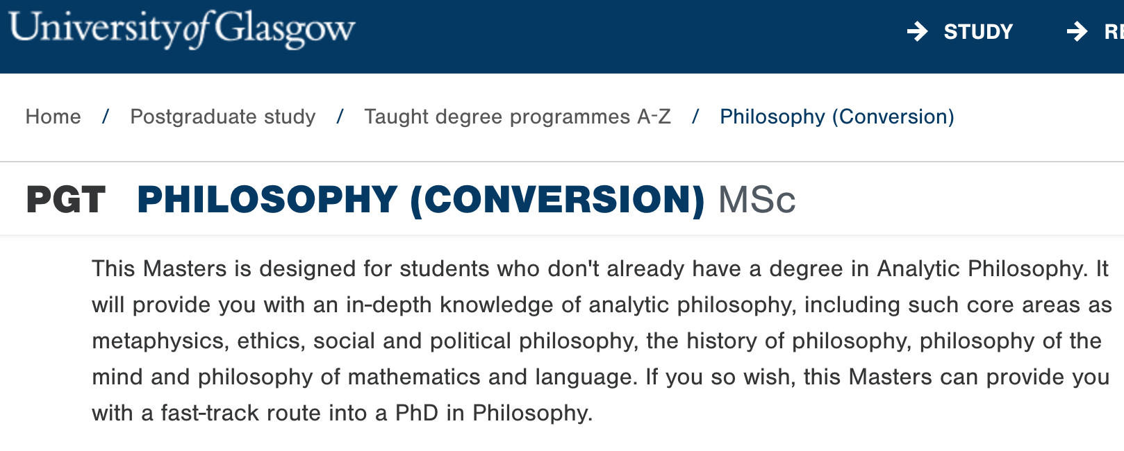 比如,格拉斯哥大学的MSc Philosophy就是专门为想跨专业申请的学生开设的课程,不限制申请者的本科专业背景。