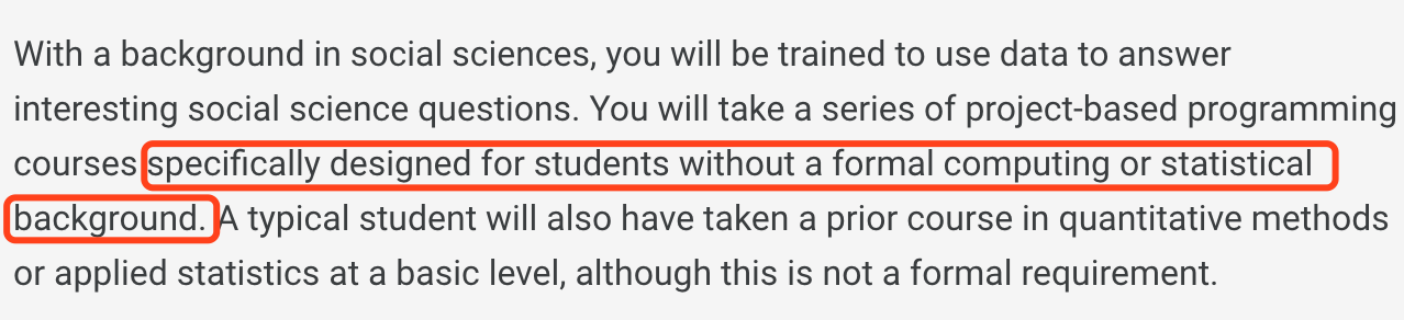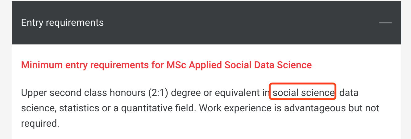 比如,LSE有一个项目叫MSc Applied Social Data Science。这个课程就是为社科类专业背景申请者开设的,即使没有计算机或统计学背景,依旧可以申请该项目。