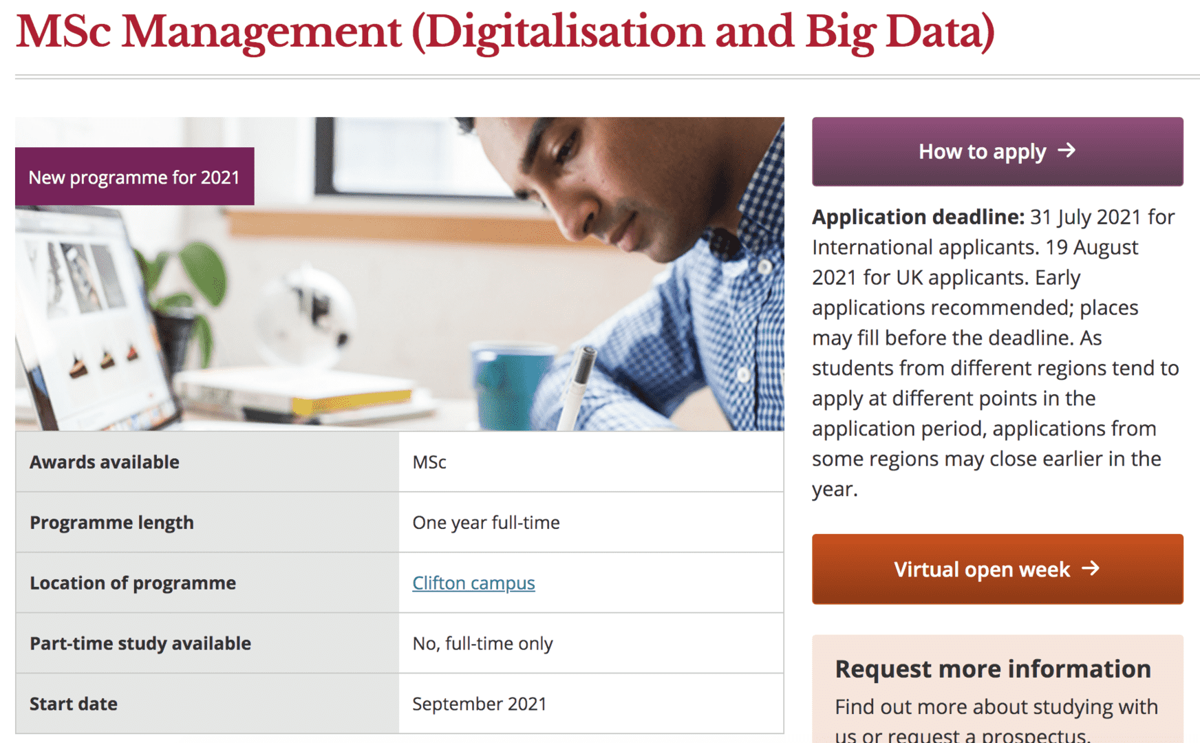 除此之外,布里斯托大学近期也宣布针对2021年入学的研究生开设新专业,其中,新开设的专业MSc Management (Digitalisation and Big Data)也设计数据分析和处理。并且,没有相关背景的同学也可以进行申请。