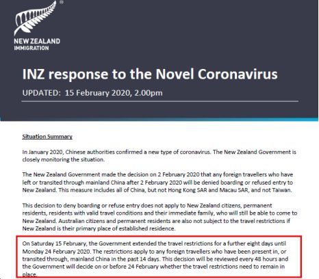 另外日前新西兰移民局发布的新西兰政府将旅行限制再延长了8天,直到2020年2月24日星期一。该限制适用于过去14天来过中国大陆或过境的任何外国旅行者,该决定将每48小时复审一次,政府将在2月24日或之前决定是否需要保留旅行限制。