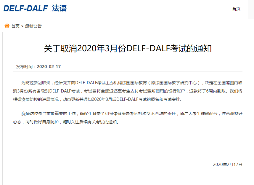 为防控新冠肺炎,经研究并商DELF-DALF考试主办机构法国国际教育(原法国国际教学研究中心),决定在全国范围内取消3月份所有各级别DELF-DALF考试,考试费将全额退还至考生支付考试费所使用的银行账户,退款将于6周内到账。我们将根据疫情防控的进展情况,动态更新并通知2020年3月后DELF-DALF考试的报名和考试安排。