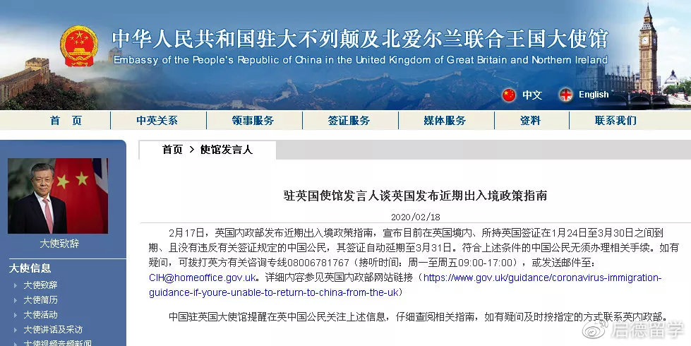 中国驻英国使馆发言人谈英国发布近期出入境政策指南