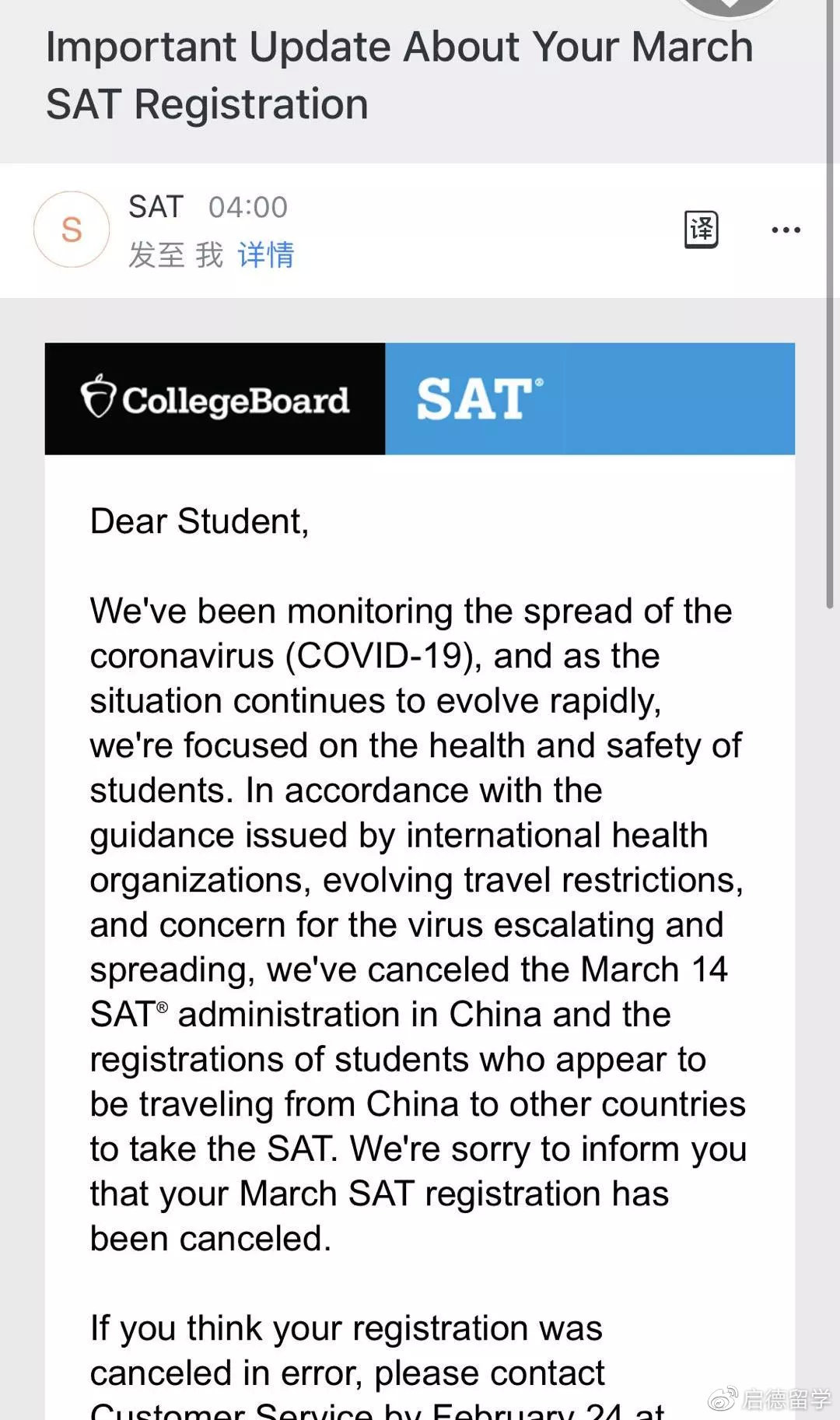 今天凌晨,我们的启德小伙伴们收到CollegeBoard的邮件通知,正式确定了取消3月份SAT考试。