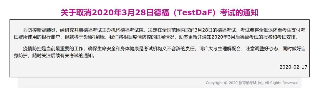 为防控新冠肺炎,经研究并商德福考试主办机构德福考试院,决定在全国范围内取消3月28日的德福考试,考试费将全额退还至考生支付考试费所使用的银行账户,退款将于6周内到账。我们将根据疫情防控的进展情况,动态更新并通知2020年3月后德福考试的报名和考试安排。