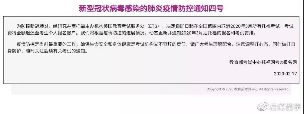 ETS发布通知,即日起在全国范围内取消2020年3月所有托福考试,考试费将全额退还至考生个人报名账户。请相关考生注意官网通知。