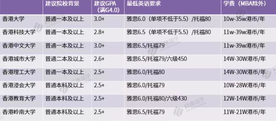 香港各专业平均录取比例大概在20-30%,学校少,申请人数多,竞争强度逐年增强,商科难度较大。课程比较密集,学习压力不小且全靠自觉。