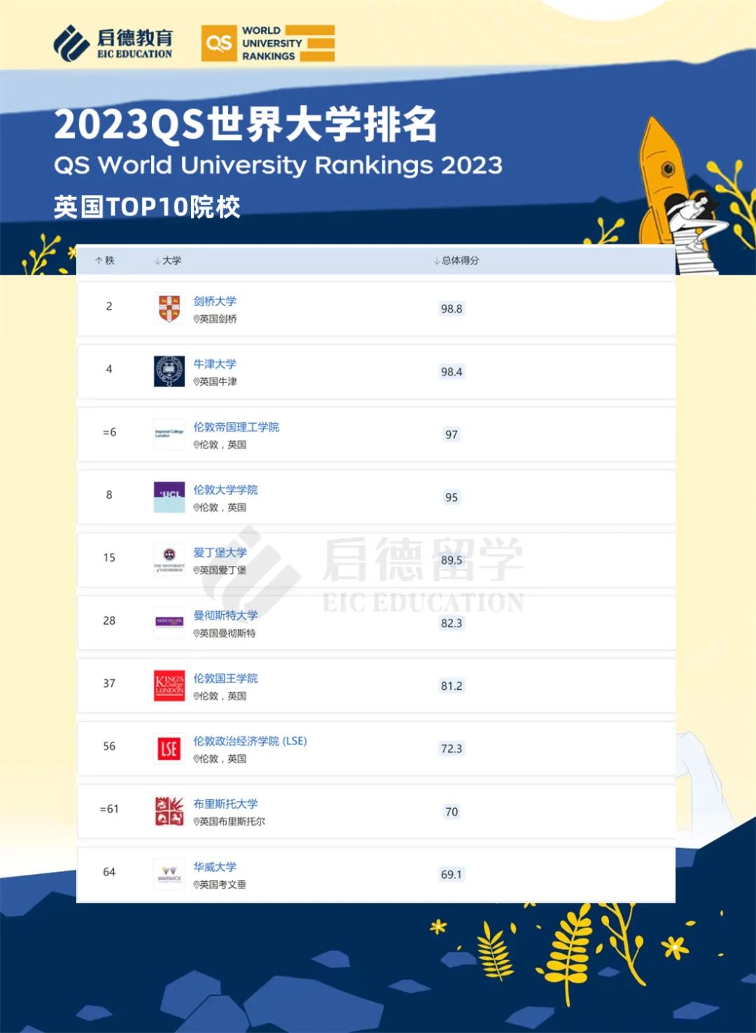 在最新发布的2023QS世界大学排名中,TOP10院校英国包揽4所:剑桥大学(第2名),牛津大学(第3名);帝国理工学院(第6名);伦敦大学学院UCL(第8名)。院校整体表现出众,实力不容小觑。