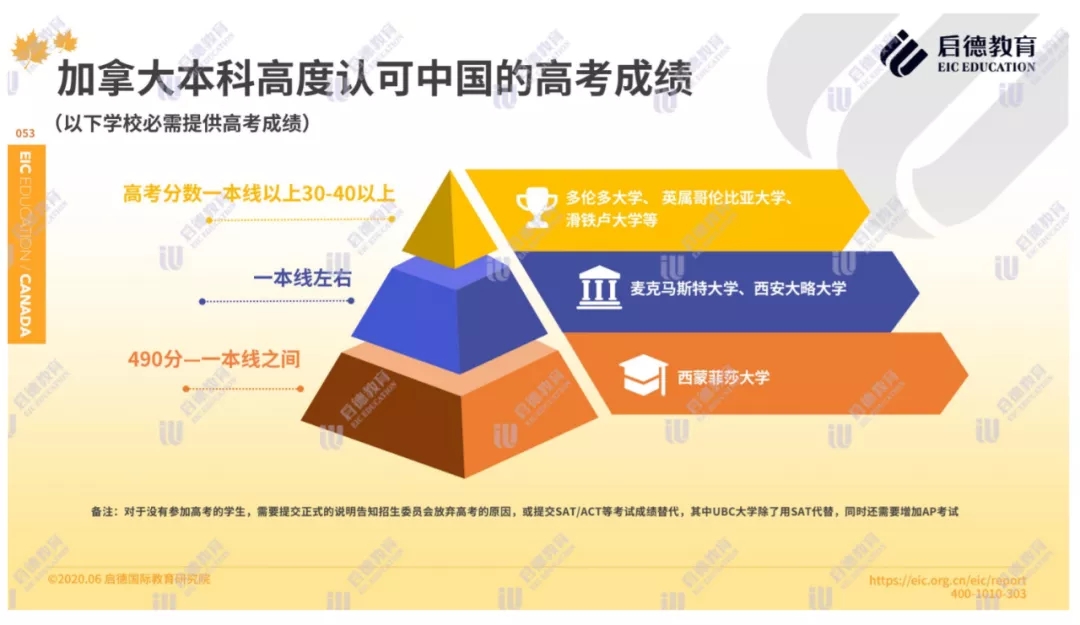 加拿大本科认可中国的高考成绩,其中多伦多大学、 英属哥伦比亚大学、麦吉尔大学、滑铁卢大学等要求高考分数一本线30-40分以上,阿尔伯塔大学、皇后大学、麦克马斯特大学、西安大略大学要求一本线左右,西蒙菲莎大学、维多利亚大学要求490分至一本线之间。此外,申请商科专业的学生语言成绩平均需要达到雅思7分,获得麦吉尔大学、多伦多大学、英属哥伦比亚大学热门专业录取的学生雅思分数大多达到7.5分。理工科学生6.5分的雅思成绩可以获得名校的青睐,文科学生的雅思成绩则需要达到7分。