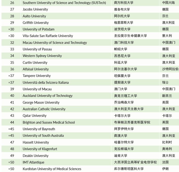 - 澳新地区共计15所年轻大学入榜,其中澳大利亚堪培拉大学上升两位;