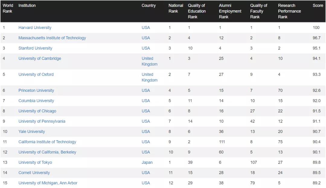 4月26日,世界大学排名中心(The Center for World University Rankings, CWUR)发布2021-2022年度世界大学排名。相比USNews和近期刚出了世界大学排名的QS等老牌排名,CWUR排名的特殊之处在于其不从学校提供的数据来判断,相对客观有力,避免了个别学校的造假行为,整体排名具一定权威性,可供大家参考。