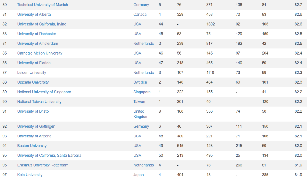 其中北京大学、清华大学、中国科学院大学和台湾大学位居世界前100名。而清华大学和北京大学排名与去年一样。