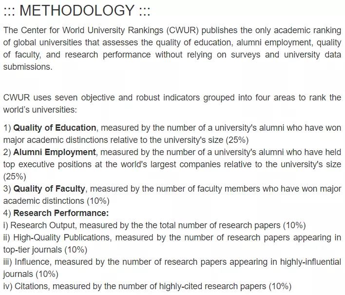 本次排名参考分成4大因素,教育质量(25%),校友就业率(25%),教师质量(10%)和研究绩效( 40%),涵盖7大指标,具体包括: