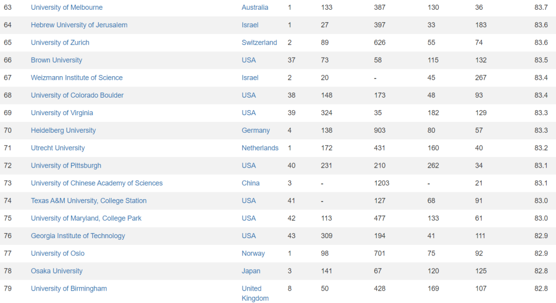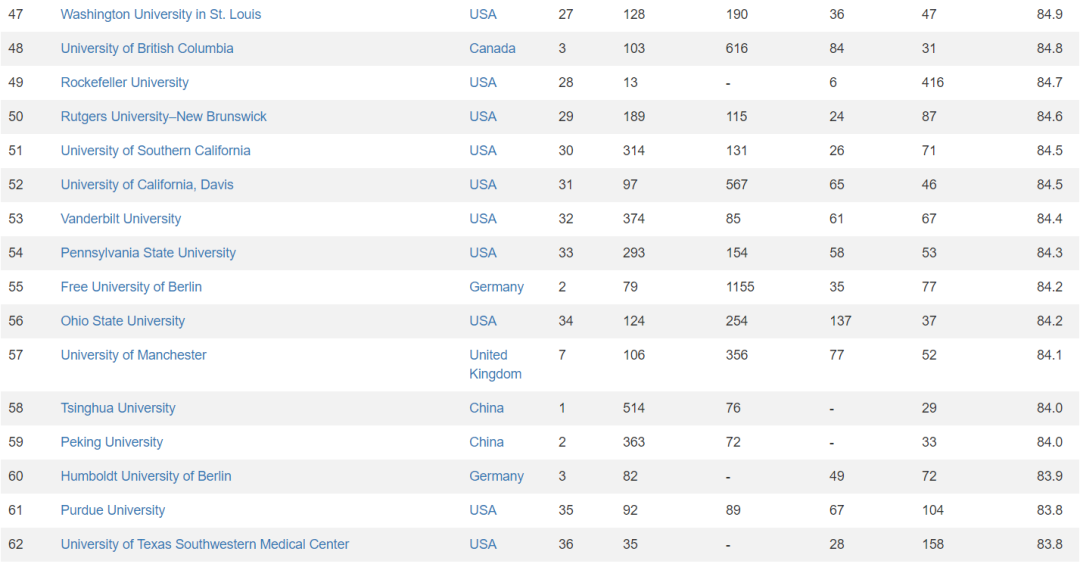 自2012年排名开始以来,美国一直在前10名中稳占8名,在前2000名中有347名美国大学中名列前茅。哈佛大学、斯坦福大学和麻省理工学院是世界上论文被引用次数最多的大学,也是常年的TOP 3。此外,常春藤盟校的8所学校都跻身了今年的前70名。