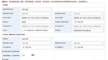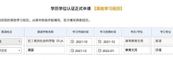 填完后需认证的学习经历后,至少再加一条学习经历,与认证学历的时间是连续的。也就是说,例如本科认证可以加上高中经历,国内外学校均可以填写,研究生可以加上本科的学习经历,只需要填写学校和起止时间即可。