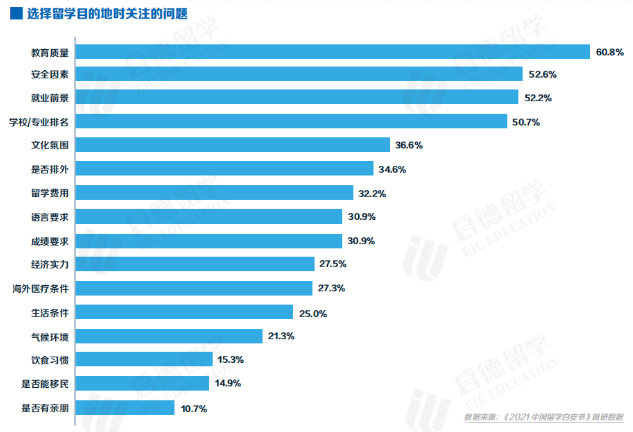 我们首先来看中国学生在选择留学目的地的时候最多会考虑哪些因素,根据《2021中国留学生白皮书》调研数据显示,主要考虑以下几个因素: