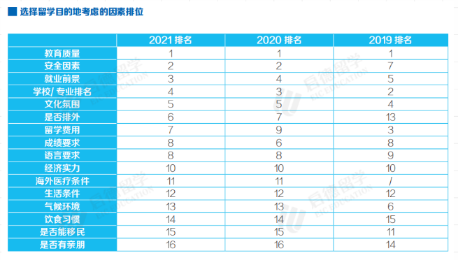 “安全因素”(52.6%)依旧是今年大家在选择留学目的地时最为关心的因素之一,仅次于“教育质量”(60.8%)。同时,“是否排外”也持续受到更多关注,排位从13位上升至第6位。 此外,人们对于“学校/专业排名”的关注度排位持续下降,而对于“就业前景”的关注度排名持续上升。而对于“留 学费用”的关注,2021年排位有小幅回升。