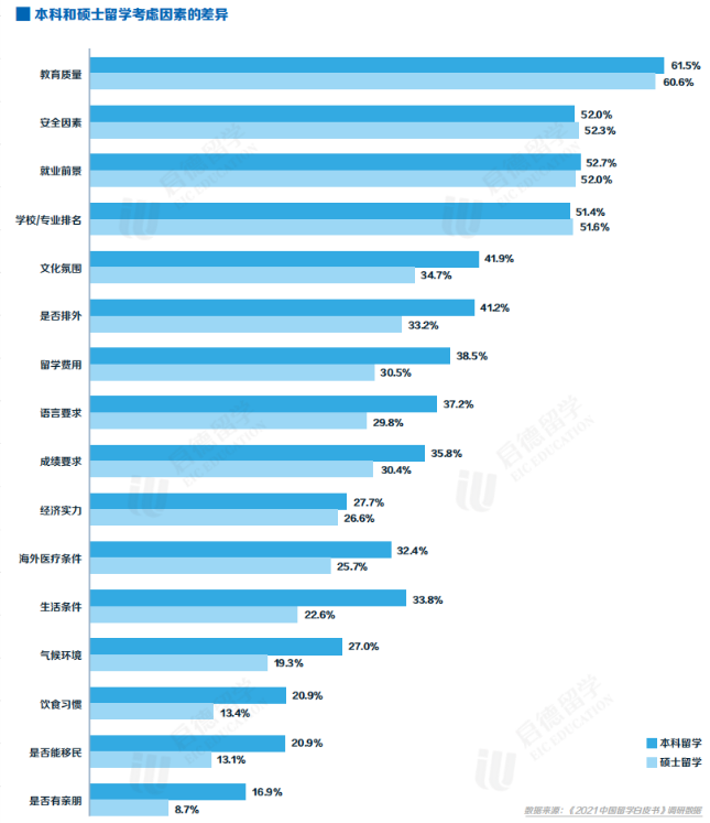 另外,在考虑因素排位中,相比于硕士留学更多考虑留学目的地的经济实力,本科留学更看重当地的生活条件。经济实力 与提供就业机会的多少紧密相关,更贴近硕士留学后就业的诉求。而本科留学更在意留学衣食住行方面的体验。