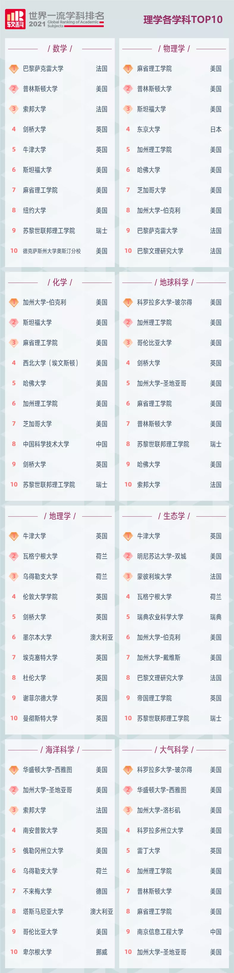 在理学排名上,英美两国排名相对靠前,法国位列第三。与20年相比,英国牛津大学在数学专业上升三位,目前位居TOP4;剑桥大学在地理学专业排名上升一位,位居第5;墨尔本大学地理学专业空降全球TOP6。