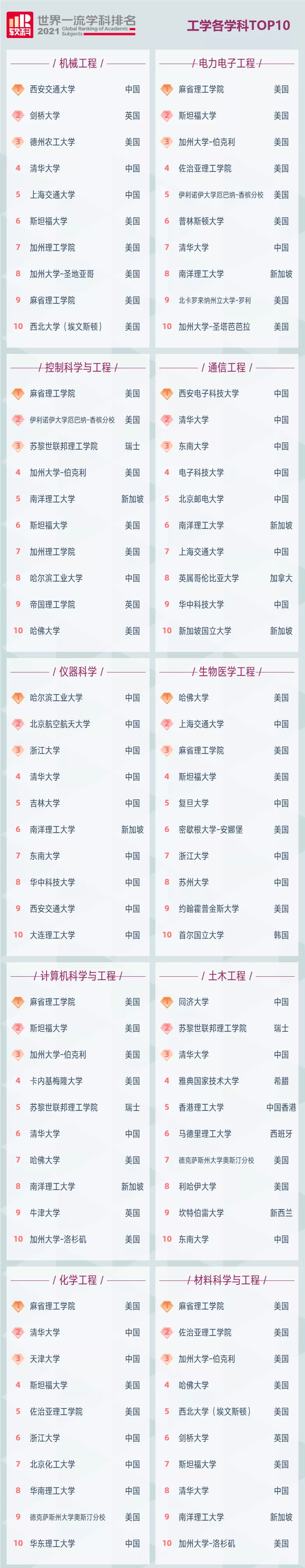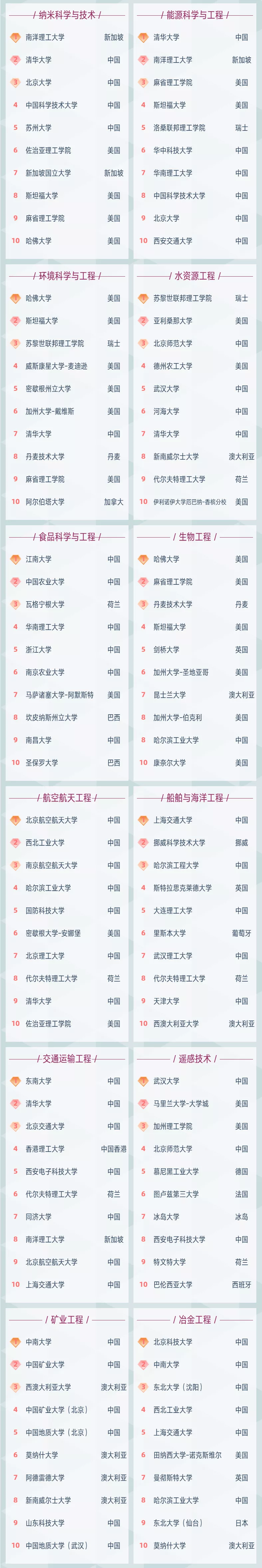 工科共22门学科中,中国和美国包揽了大部分头部位置。其中美国占据了8个专业的TOP1,麻省理工学院表现最优;中国占据了14个专业的TOP1,清华大学首当其冲。
