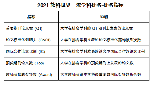“软科世界一流学科排名”使用一系列国际可比的客观学术指标对全球大学在相关学科的表现进行测量,排名指标包括学科国际权威奖项、学科顶尖成果、高水平科研产出、科研质量、国际合作等。