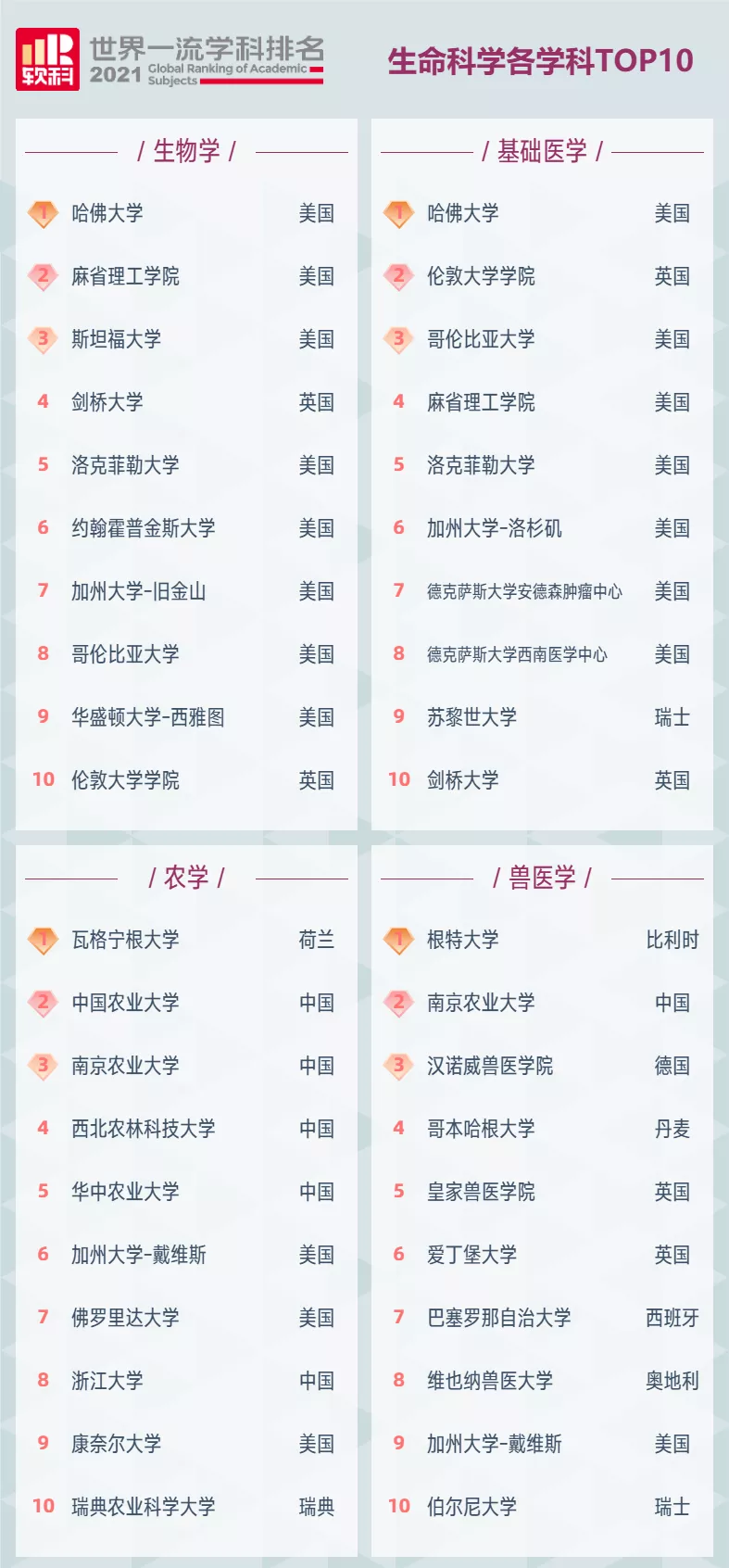 医学专业方面,头部排名变化不大。美国纽汉霍普金斯大学在生物学专业上升4位;中国南京农业大学空降兽医学TOP2。