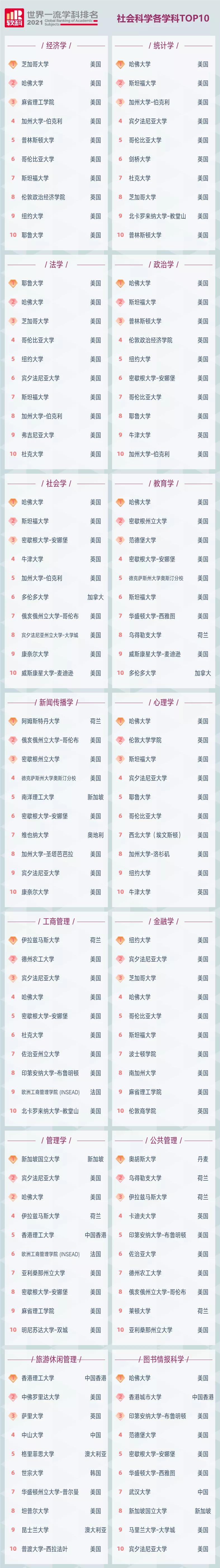 在社会科学专业的全球排名中,芝加哥大学跻身统计学专业全球TOP10;杜克大学空降法学专业TOP10,同时斯坦福大学上升3位;加拿大多伦多大学跻身教育学全球TOP10;另外,维也纳大学和康奈尔大学空降新闻传播学全球TOP10,南洋理工大学也从该专业第9名上升至第5名;荷兰伊拉兹马斯大学在工商管理专业荣耀登顶全球专业排名TOP1。