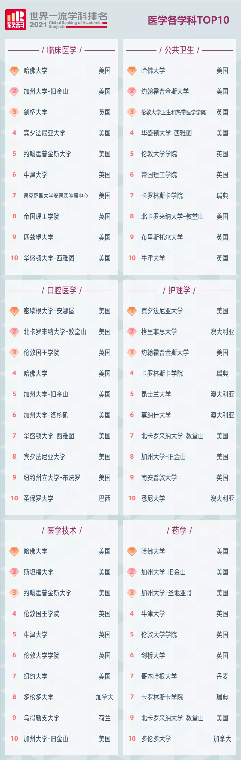 和去年一样,美国包揽了医学专业前列,6项专业排名中,哈佛大学占据了4门学科的全球第一,实力不可小觑。