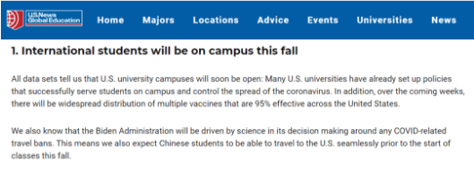 U.S.News网站发文,据U. S. News Global Education主席Tom Dretler表示,国际生或将于今年秋季回归校园。消息一出,被网课“折磨”的学生们彷佛看到了返校的“曙光”。