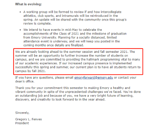 埃墨里大学Emory University计划于2021年秋季线下开学。