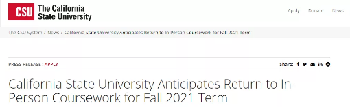 美国加州州立大学也早早就发出了通告,宣布将在2021年秋季学期重新开放23个校区,让学生回到校园返校进行线下授课。