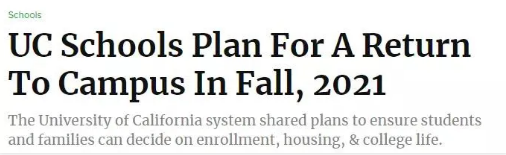 同样是公立大学的UC系也紧跟其后发布了返校计划:宣布其10个校区都将在2021年秋季恢复面对面授课。