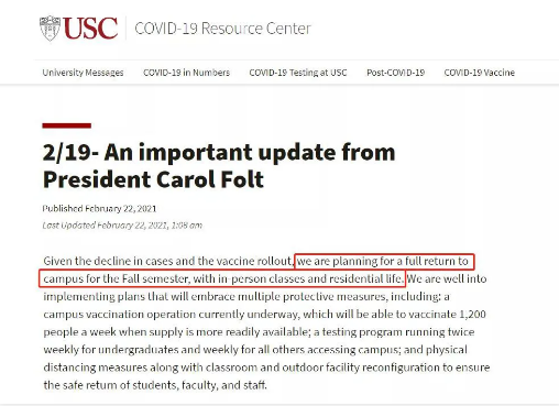 南加州大学校长Carol Folt在发给学生的邮件中宣布:随着疫情得到控制,学校计划在2021年秋季学期全面恢复校园活动,并向学生提供线下课程和住宿。