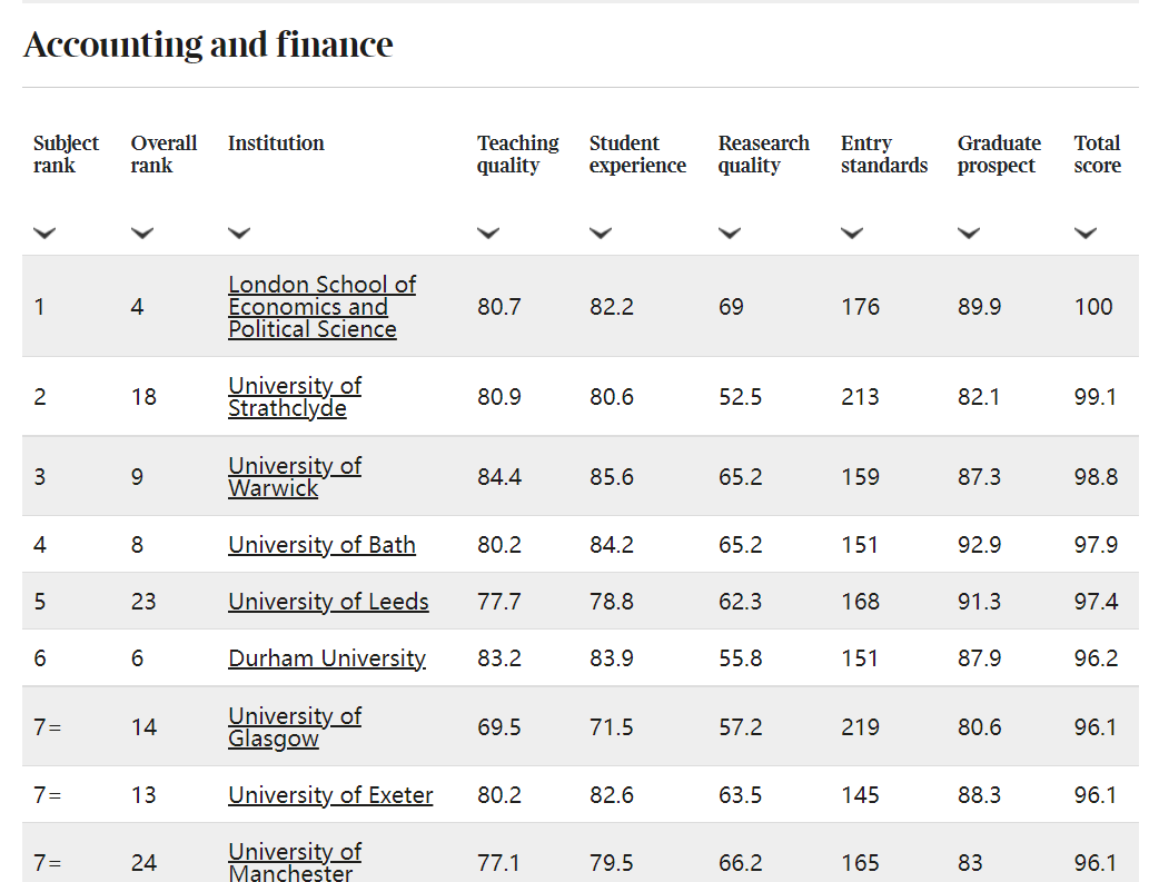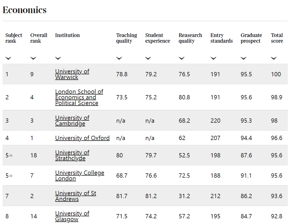 TIMES排名一共有8大指标,分别是:学生满意度(分为教学质量和学生体验),科研质量,准入标准,毕业生前景,二等一及以上学位获得率,毕业率和师生比例。 TIMES不仅有对学校的排名还有针对各专业的单科排名,可以作为同学们申请学校的参考名单。 那么2023年,英国大学的排名是怎么样的呢?首先,牛津大学被评为了英国最佳大学,12年来首次在英国大学排名中名列前茅,并击败了竞争对手剑桥大学。 这次爱丁堡大学的排名也有很大的变化,从去年的第13名前进3名到了前十。而伦敦政治经济学院和帝国理工学院,名次与2022年进行了调换。LSE排名第4,IC排名第5. 前20的名单: 其中,埃克塞特大学进步最大,从去年的21名到了13名。 会计与金融的排名: 经济学排名: 更多名单,见官网www.thetimes.co.uk 最后,排名只是一个参考,每个排名都有自己不同的标准,同学们在选校的时候还是要根据自己自身的背景和意向确定最适合自己的选校名单。