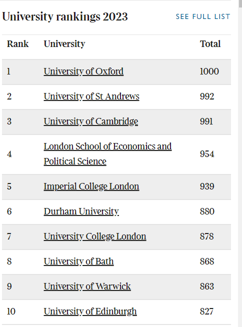9月16号,《泰晤士报》(The Times)和《星期日泰晤士报》(The Sunday Times)联合发布了他们的2023年优秀大学指南( the Good University Guide 2023)