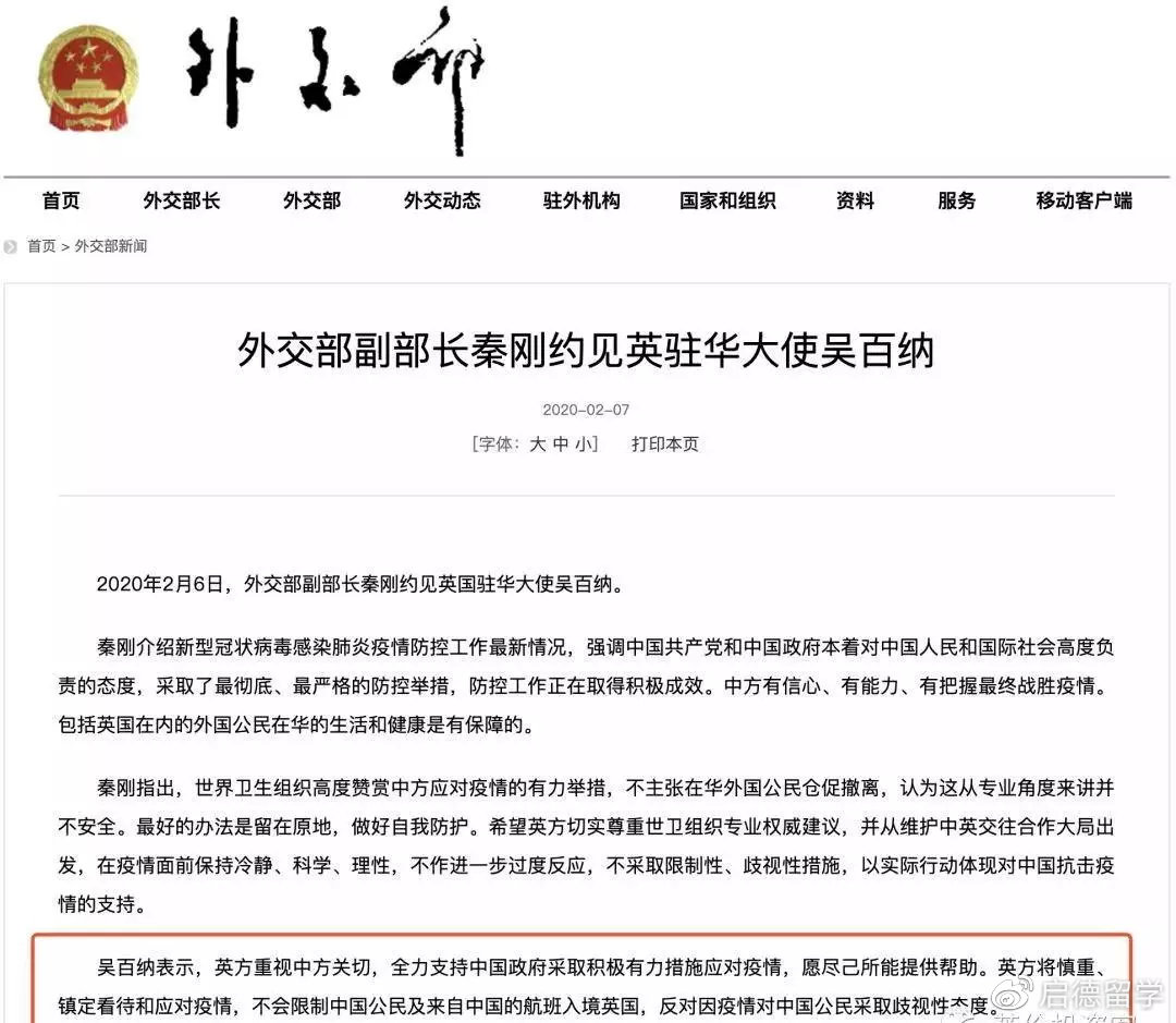 英方重视中方关切,全力支持中国政府采取积极有力措施应对疫情,愿尽己所能提供帮助。英方将慎重、镇定看待和应对疫情,不会限制中国公民及来自中国的航班入境英国,反对因疫情对中国公民采取歧视性态度。